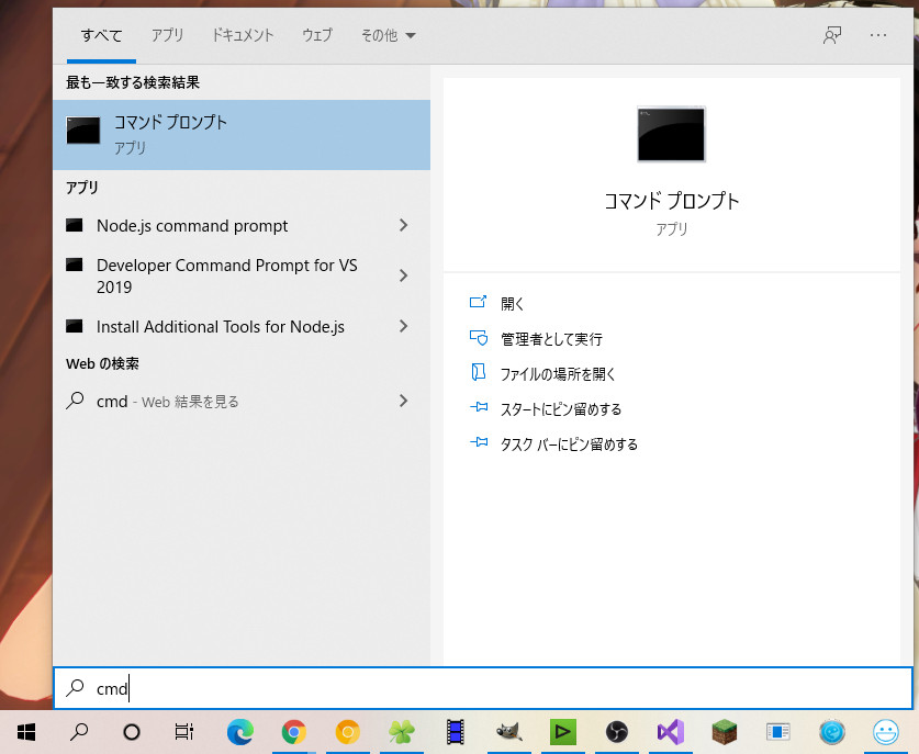 検索で、「cmd」と入力して「コマンドプロンプト」を選択。